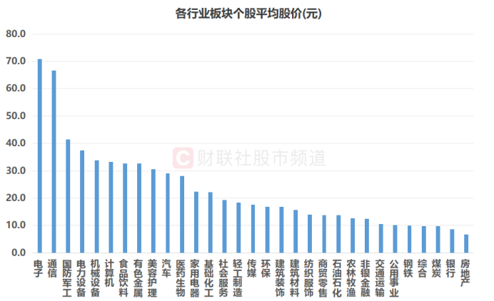 从板块平均股价来看,当今共有9个行业板块个股均价在30元以上,永诀为电子、通讯、国防军工、电力树立、机械树立、打算机、食物饮料、有色金属、好意思容照料板块,其中,电子、通讯板块以70.92元、66.72元的均价位列冠军、亚军。而房地产、银行、煤炭、概述、钢铁板块个股均价不及10元。