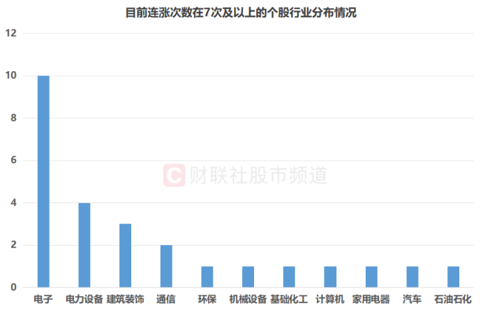 注:当今连涨次数在7次及以上的个股行业散播情况(去世4月17日收盘)